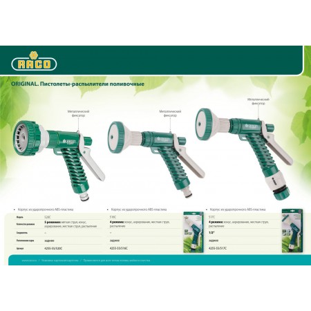 Поливочные пистолеты-распылители RACO Original являются самыми распространёнными и доступными. Изготовлены из надёжных материалов, обладают высоким уровнем качества.