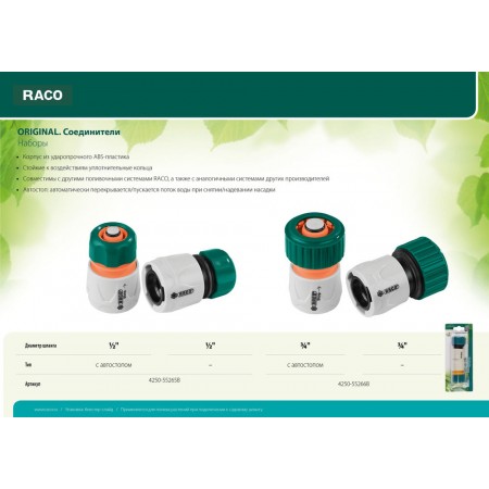 Набор быстросъемный соединитель для шланга ORIGINAL 1/2" + 1/2" с автостопом, из ABS пластика RACO 4250-55265B