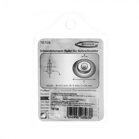 Режущий элемент, ролик трубореза для артиколов 78705, 78706, 4.5 х 3 х 16 мм, для резки труб из цветных металлов Gross (78708)