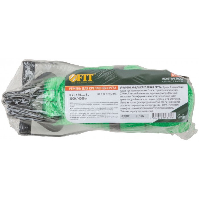 Профи. Для фиксации грузов при транспортировке. Замок с храповым механизмом размером 230 мм. Храповый механизм с чернёным электрофорезным покрытием. Полиэфирная лента с увеличенным запасом прочности, устойчивая к агрессивным средам и к УФ излучению. Лента не горюча (температура плавления 260°C) и сохраняет эластичность при низких температурах до- 60°C. Материал: