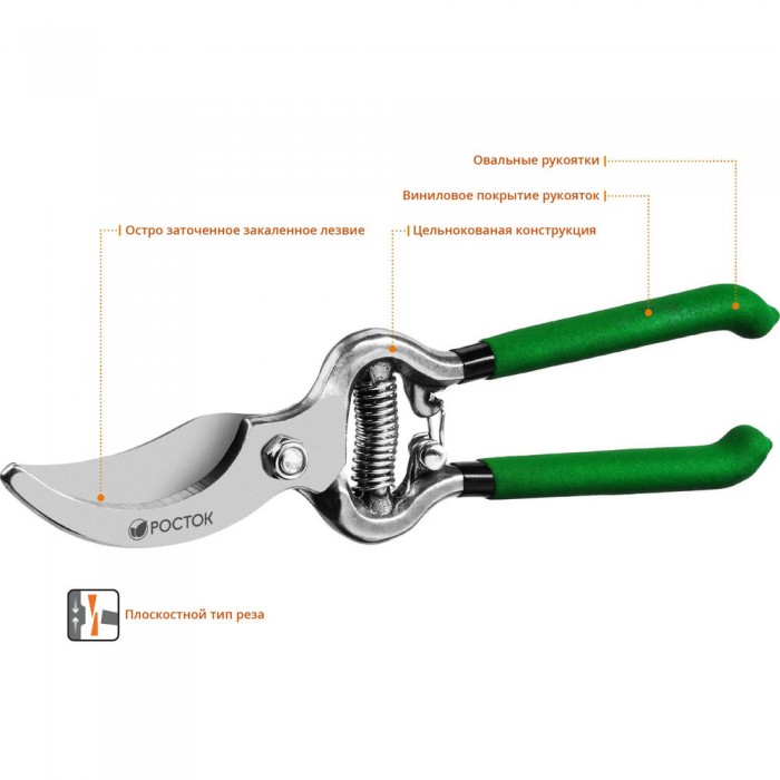 Плоскостной секатор 200 мм, углеродистая сталь, ст45, цельнокованый, с овальными рукоятками РОСТОК PC-19 423006