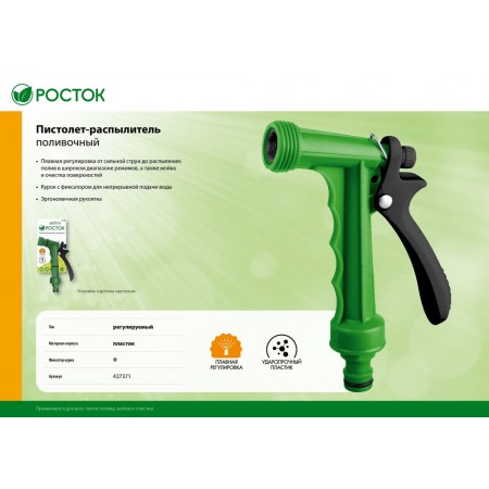 Поливочные наконечники и пистолеты-распылители РОСТОК надёжны и долговечны. Обеспечивают быстрое подключение к поливочной системе и долговременный полив, изготовлены из ударопрочного пластика.