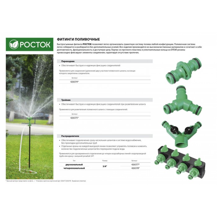 Аксессуары РОСТОК для поливочных систем надёжны и долговечны, изготовлены из ударопрочного пластика. Обеспечивают быстрое и простое соединение элементов.