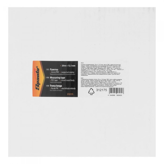 Рулетка геодезическая, 20 м х 12,5 мм, лента ПВХ, закрытый круглый корпус Sparta