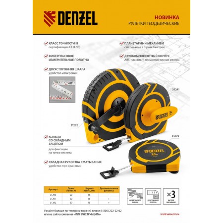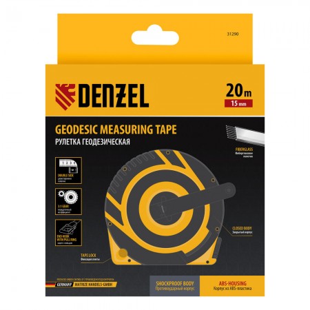 Рулетка геодезическая 20 м х 15 мм, закрытый корпус, фиберглассовая лента Denzel