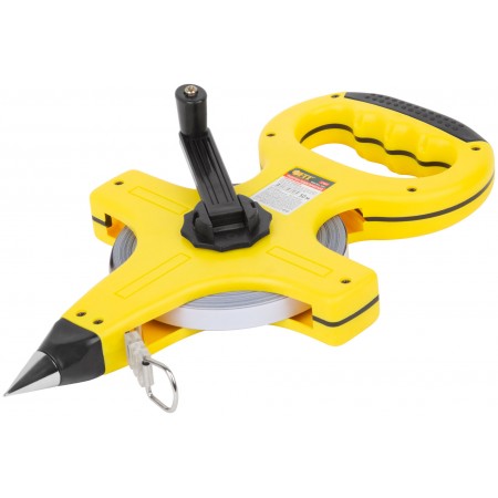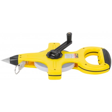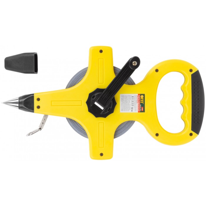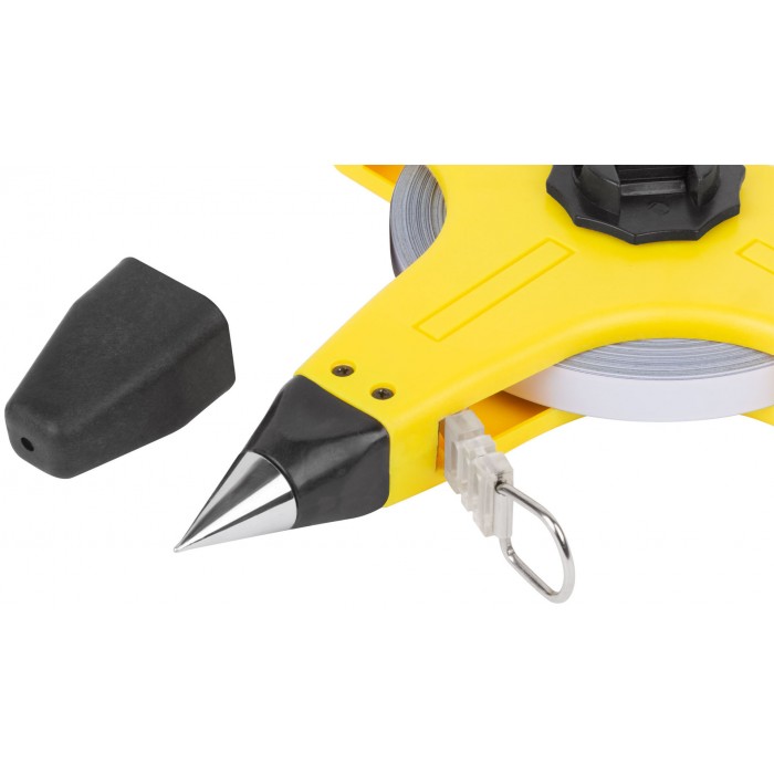 Со штыком для фиксации рулетки в земле при измерении больших длин. Материал: стальная лента, корпус из ударопрочного ABS пластика, прорезиненная ручка.