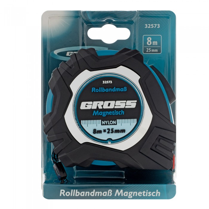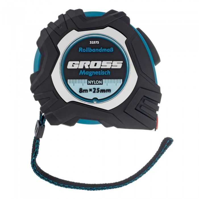 Рулетка Magnetisch 8 м х 25 мм,обрезиненный корпус,автоматическая фиксация,Нейлоновое покрытиеытие,зацеп с магнитом Gross