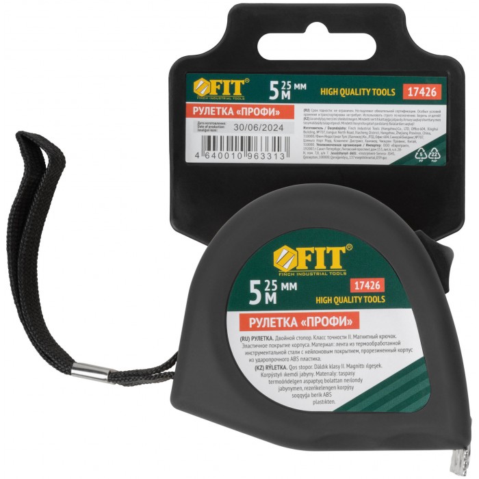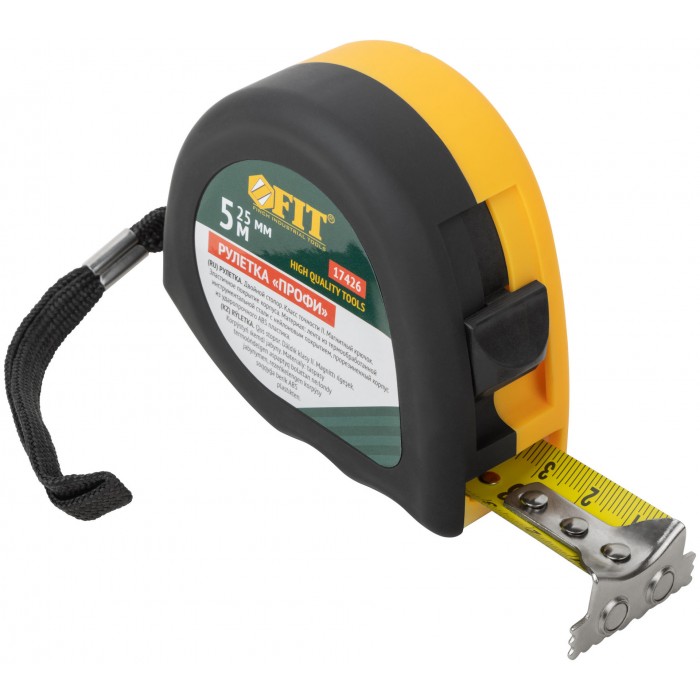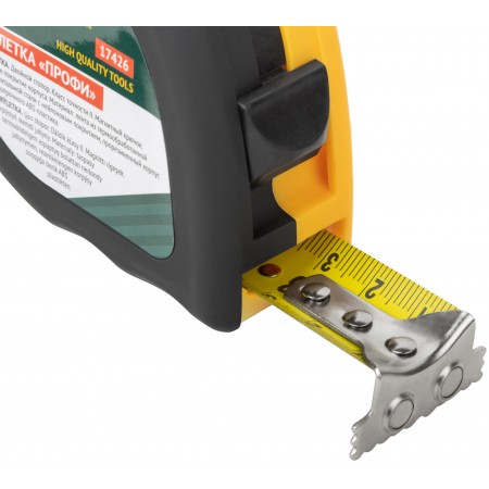 «Профи». Калиброванная лента класс II, двойной стопор, магнитный крючок. Материал: стальная лента с нейлоновым покрытием, эластичный двухцветный ABS пластиковый противоударный корпус. Упаковка: пластиковый подвес.