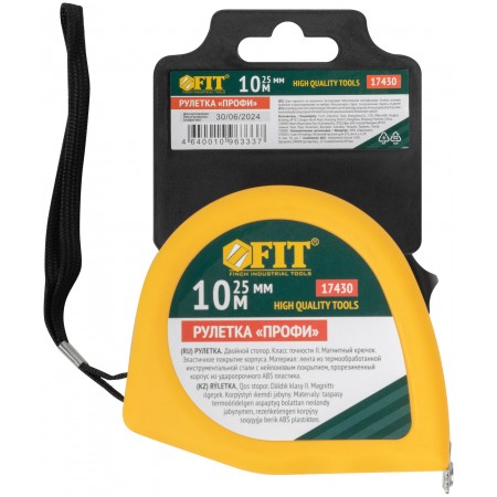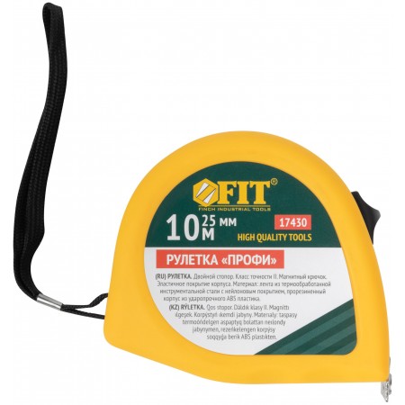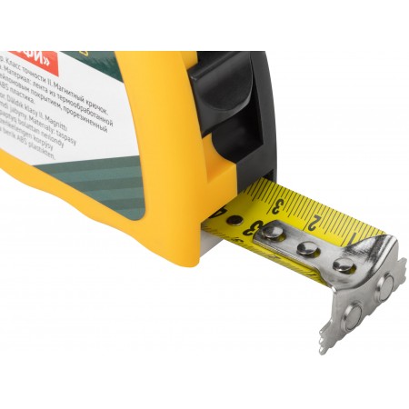 «Профи». Калиброванная лента класс II, двойной стопор, магнитный крючок. Материал: стальная лента с нейлоновым покрытием, эластичный двухцветный ABS пластиковый противоударный корпус. Упаковка: пластиковый подвес.