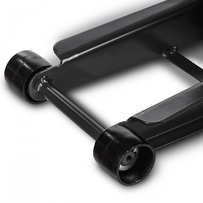 Рельефная рукоятка не скользит в руках, обеспечивая надежный захват. Кроме того, она поможет избежать повреждений при случайном открытии двери автомобиля. Предусмотрена ниша для хранения крепежа. Поворотные колеса облегчают перевозку домкрата. Резиновый упор подъемной лапы повышает безопасность в процессе эксплуатации домкрата.