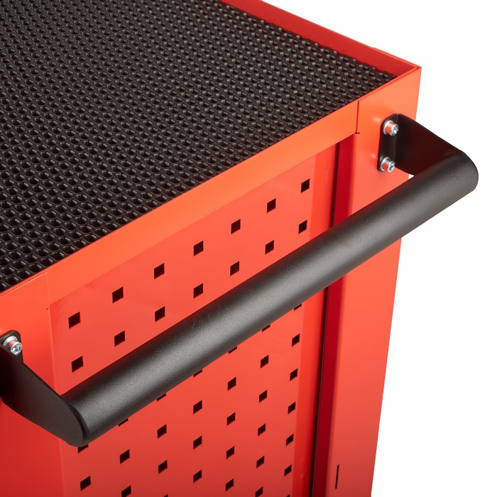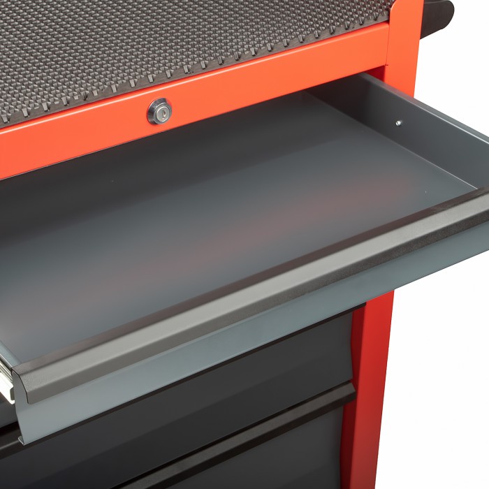Выдвижные ящики разного размера для организации инструмента по категориям. Максимальная нагрузка — 350 кг, подходит для тяжёлого оборудования и оснастки. Функция блокировки колёс предотвращает самопроизвольное движение тележки при работе. Текстурные ручка тележки для удобного использования в перчатках. Центральный замок для защиты содержимого от несанкционированного доступа. Тележка выполнена из сварной рамы и листового каркаса из металла толщиной 1.2 мм, что гарантирует прочность конструкции и долговечность в условиях интенсивной эксплуатации.