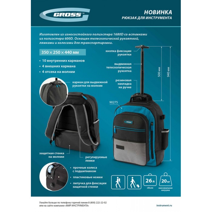 Рюкзак для инструмента, 440х350х250мм, выдвижная рукоятка, колеса Gross