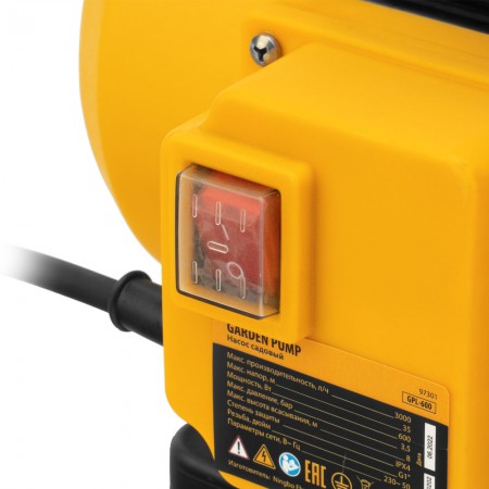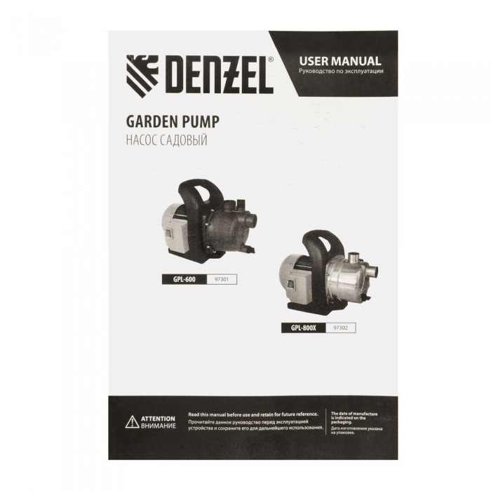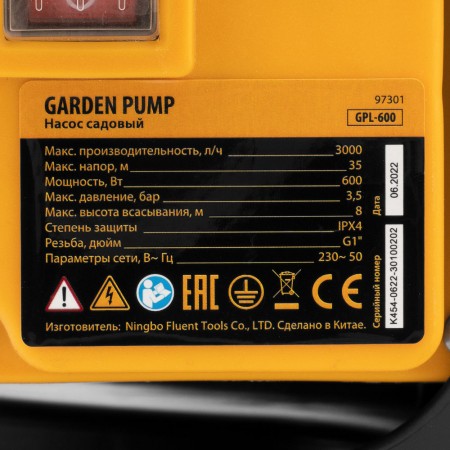 Садовый поверхностный насос GPL600, 600 Вт, 3000 л/ч, подъем 35 м, пластик Denzel (97301)
