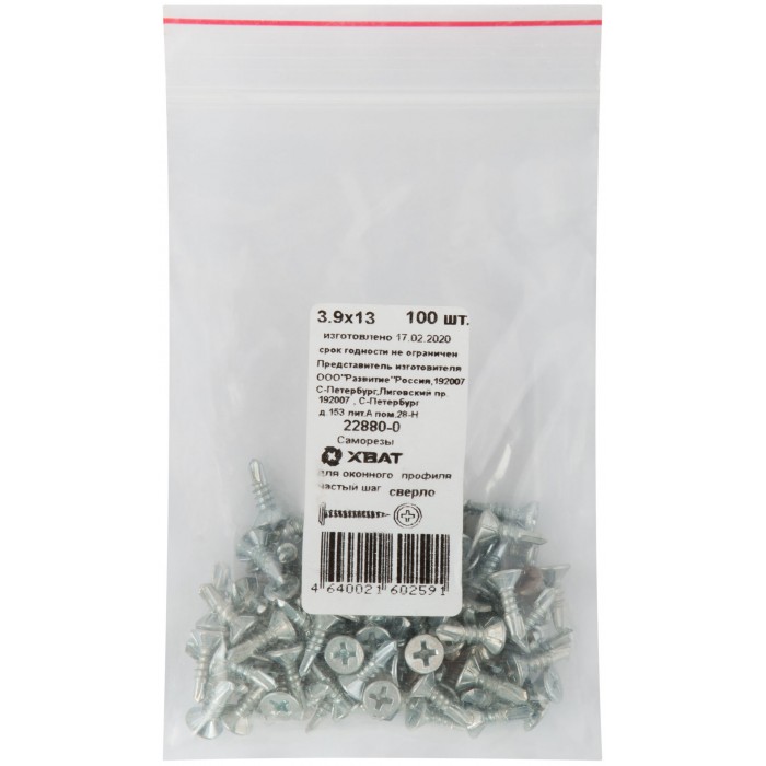 Саморез для оконного профиля частый шаг резьбы, наконечник сверло №2 3.9х13 100 шт. Фасовка (22880-0)