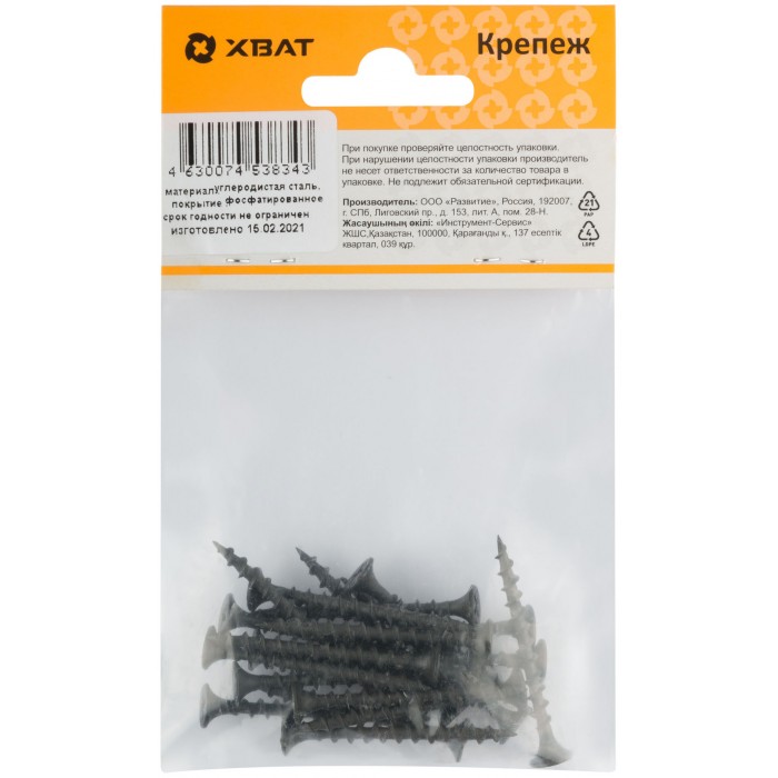 Фосфатированный. Предназначен для крепления материалов к основанию без предварительного сверления. Основная область применения – крепление листов гипсокартона к деревянным конструкциям. Острый наконечник, редкий шаг резьбы и рожковая головка идеально подходят для крепления гипсокартонных плит даже при небольшом крутящем моменте.