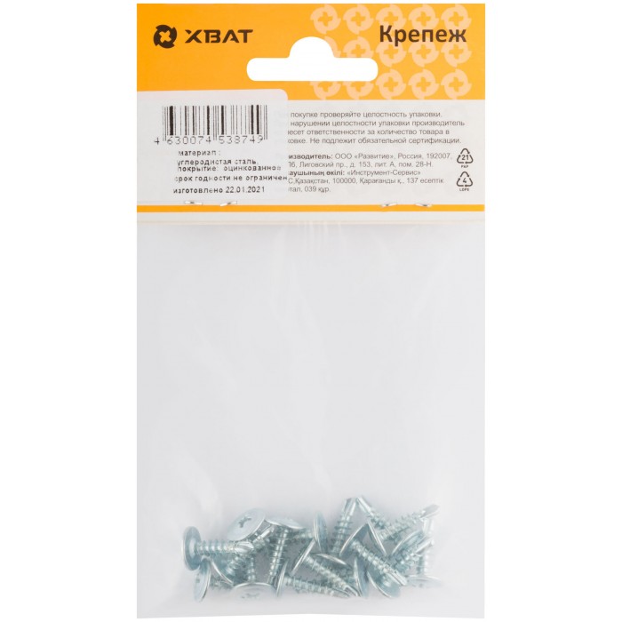 С пресс-шайбой, оцинкованный, полусферическая головка PH2. Частый шаг резьбы. Подходит для крепления как к деревянным конструкциям, так и к металлу. При толщине металла до 2 мм - не требует предварительного сверления.