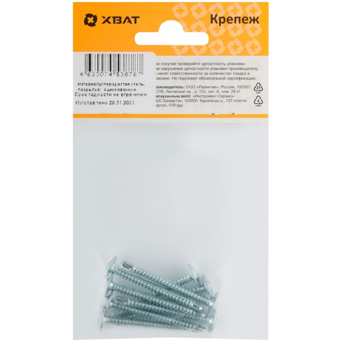 С пресс-шайбой, оцинкованный, полусферическая головка PH2. Частый шаг резьбы. Подходит для крепления как к деревянным конструкциям, так и к металлу. При толщине металла до 2 мм - не требует предварительного сверления.