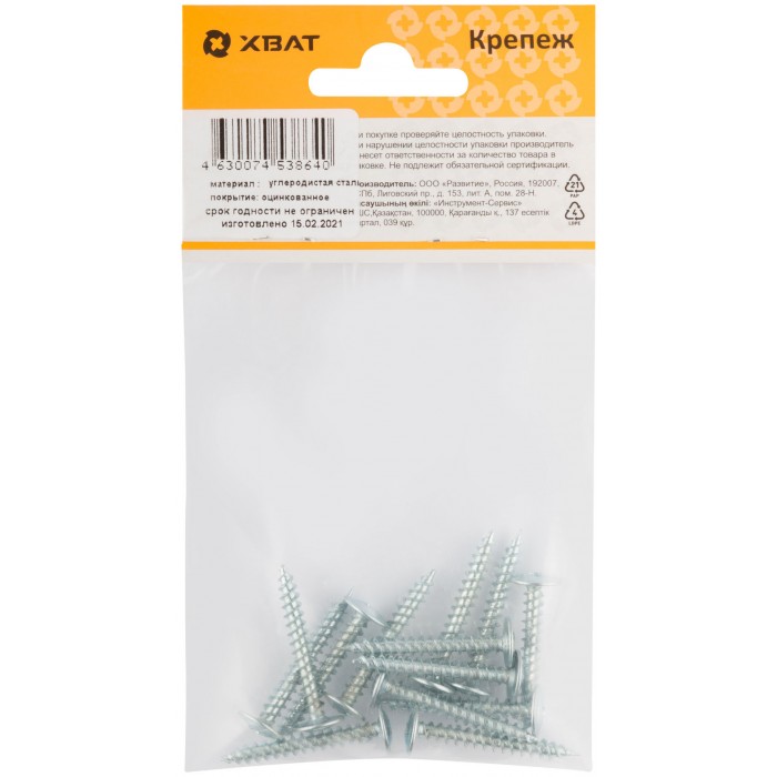 С пресс-шайбой, оцинкованный, полусферическая головка PH2. Частый шаг резьбы. Подходит для крепления как к деревянным конструкциям, так и к металлу. При толщине металла до 0,9 мм - не требует предварительного сверления.