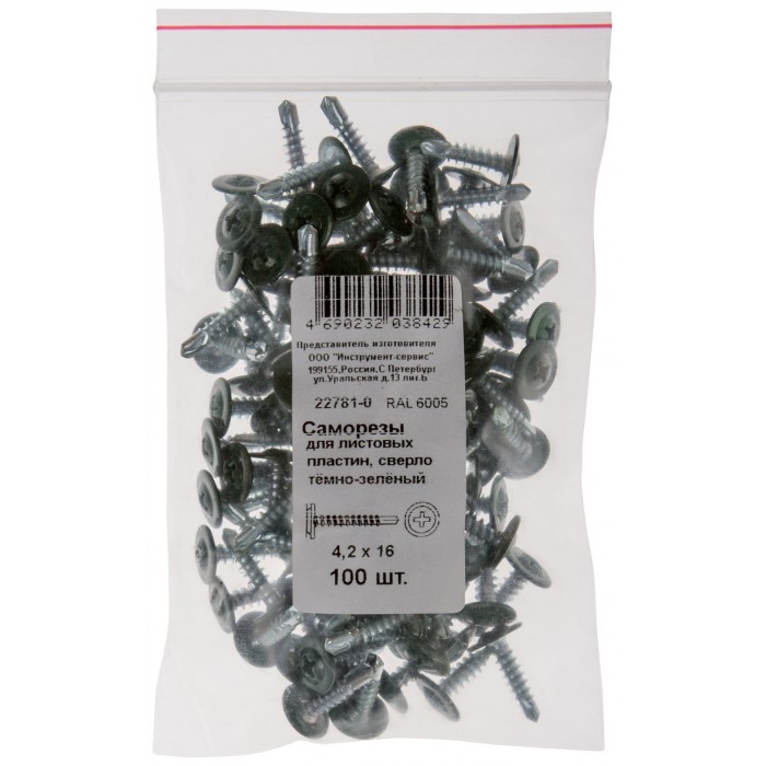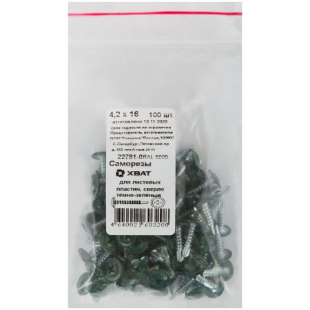 Саморезы для листовых пластин, сверло 4,2 х 16 темно-зеленый 100 шт,RAL 6005 Фасовка (22781-0)