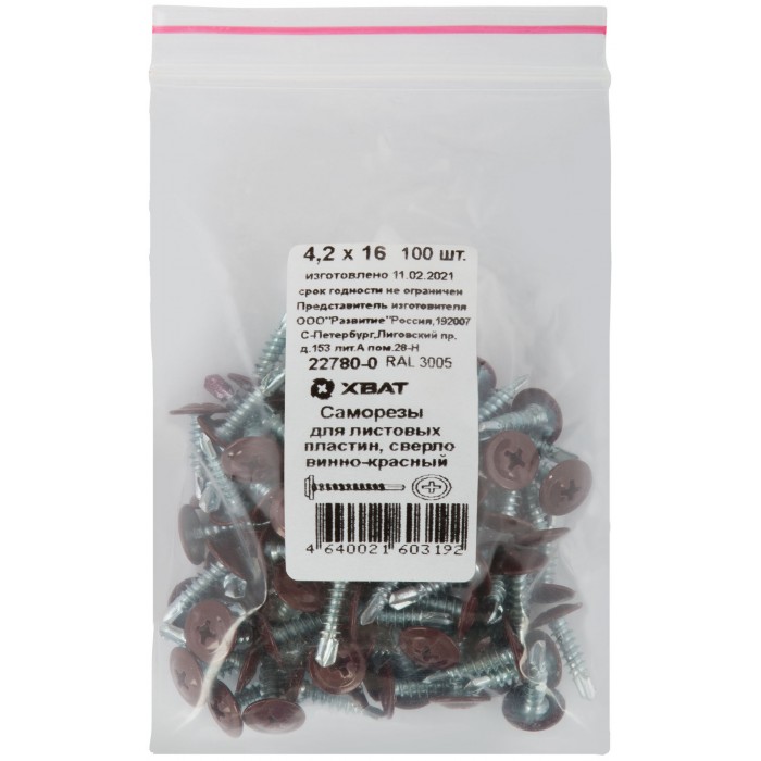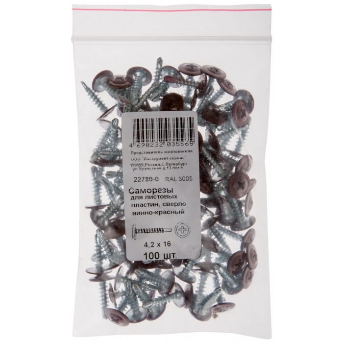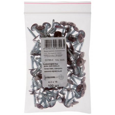 Саморезы для листовых пластин, сверло 4,2 х 16 винно-красный 100 шт,RAL 3005 Фасовка (22780-0)