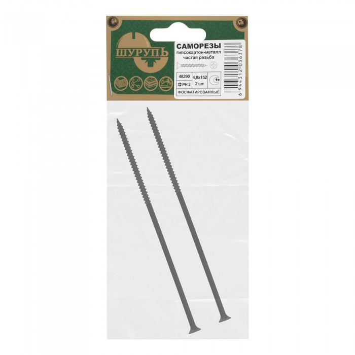 Саморезы по гипсокартону частая резьба, 4.8 х 152, PH №2, фосфатированные 2 шт Шурупь (48290)