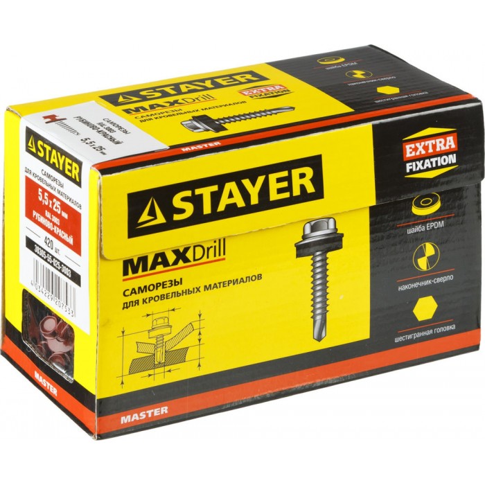 Кровельные саморезы STAYER изготовлены из высокоуглеродистой закаленной стали. Поверхностная твердость мин. 560HV, твердость в сердцевине 240-425HV. Шайба с прокладкой из износостойкой резины EPDM предназначена для герметизации соединения. Шестигранная головка с размером под ключ 8мм позволяет закручивать саморез с большим усилием.