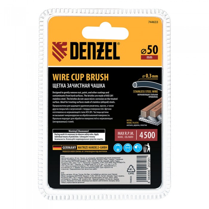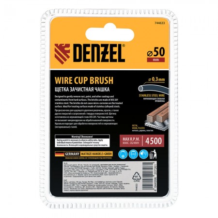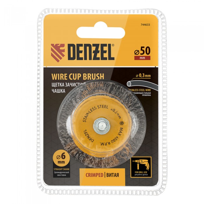 Щетка для дрели, 50 мм, Чашка, со шпилькой, нержавеющая витая проволока Denzel (744633)