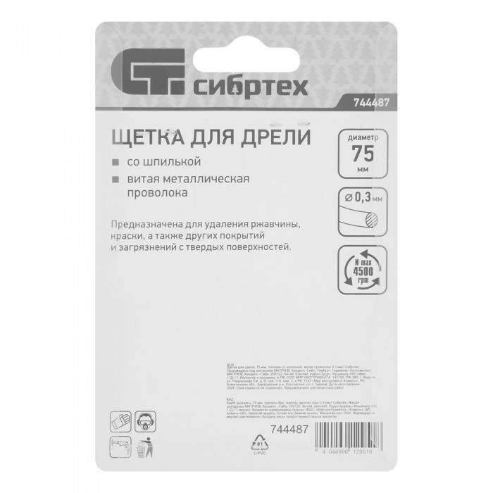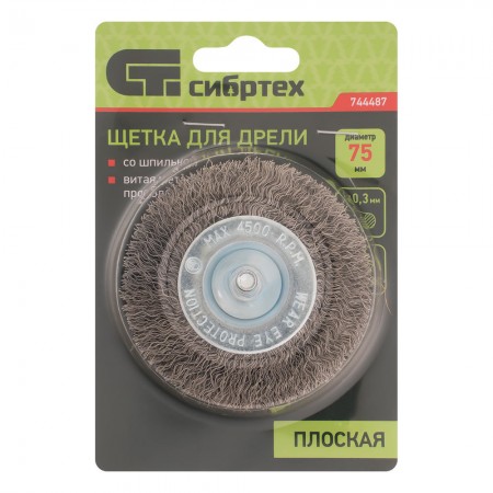 Щетка для дрели, 75 мм, плоская со шпилькой, витая проволока Сибртех (744487)