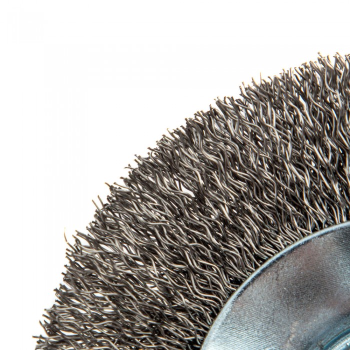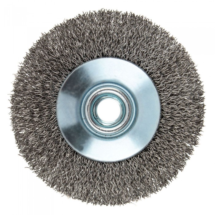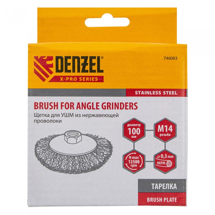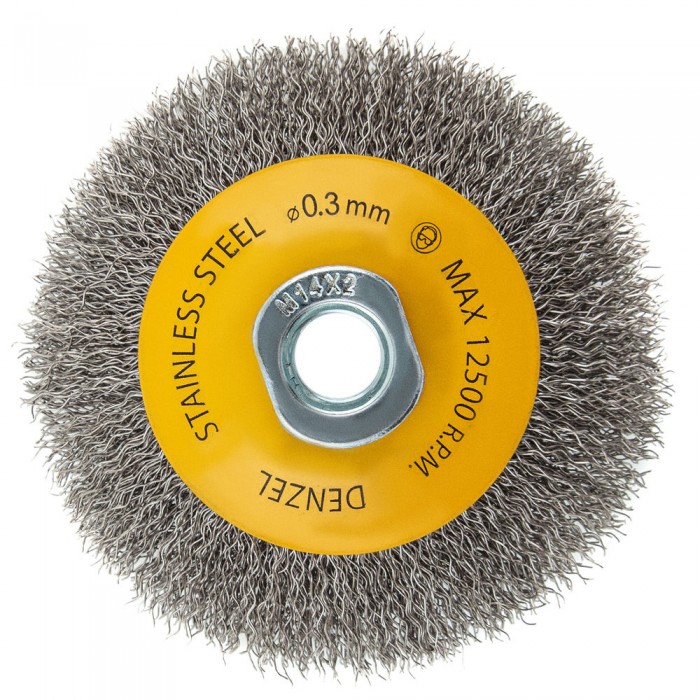 Щетка для УШМ, 100 мм, "Тарелка", витая нержавеющая проволока 0.3 мм, М14 Denzel (746083)