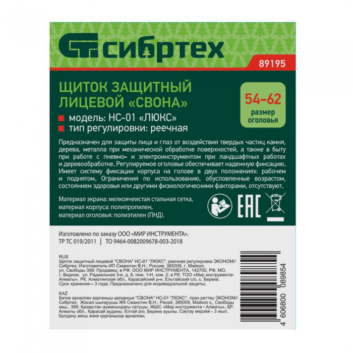Щиток защитный лицевой "Свона" НС-01 "Люкс", реечная регулировка Эконом Сибртех (89195)
