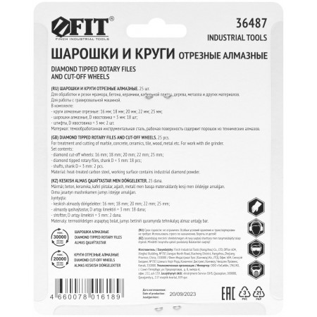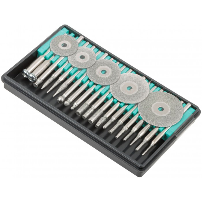 Для обработки и резки мрамора, бетона, керамики, дерева, металла и др. материалов. Для работы с гравировальной машинкой. В комплекте: Круги алмазные отрезные: 16 мм; 18 мм; 20 мм; 22 мм; 25 мм. Шарошки алмазные: 18 шт. Штифт D 3 мм: 2 шт. Материал: инструментальная сталь, режущая кромка содержит порошок из технических алмазов. Упаковка: блистер.