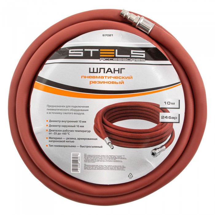 Шланг пневматический резиновый, 10 x 16 мм, 24 бар, армированный, быстросъемное соединение, 10 м Stels (57021)