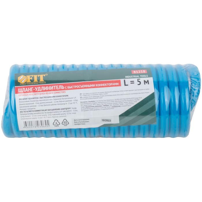 Износостойкий. Шланг-удлинитель с коннекторами европейского типа. Соединение быстросъемное 1/4''. Диаметр внутренний - 8 мм, диаметр внешний - 12 мм. Рабочее давление - 6 бар, максимальное давление - 12 бар. Диапазон рабочих температур от -15 до +45 °С. Материал: полиуретан.