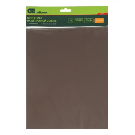 Шлифлист на бумажной основе, P 1000, 230 х 280 мм, 10 шт, влагостойкий Сибртех (756247)