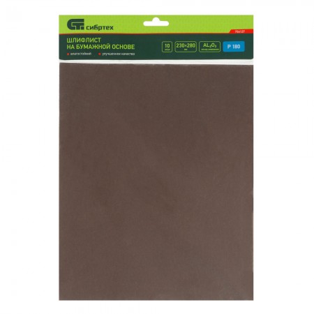 Шлифлист на бумажной основе, P 180, 230 х 280 мм, 10 шт, влагостойкий Сибртех (756127)