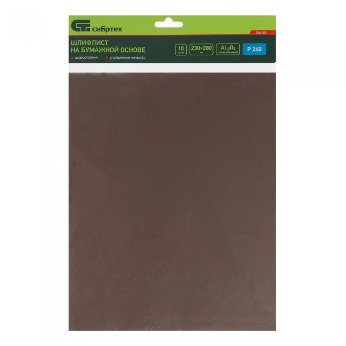 Шлифлист на бумажной основе, P 240, 230 х 280 мм, 10 шт, влагостойкий Сибртех (756147)
