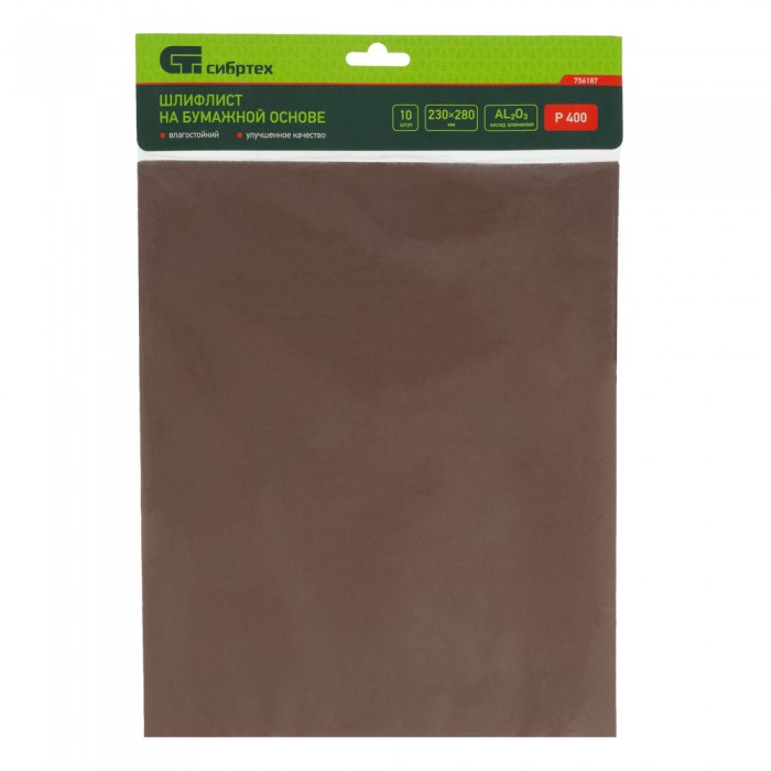 Шлифлист на бумажной основе, P 400, 230 х 280 мм, 10 шт, влагостойкий Сибртех (756187)