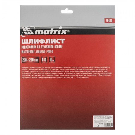 Шлифлист на бумажной основе, P 80, 230 х 280 мм, 10 шт, водостойкий Matrix (75606)