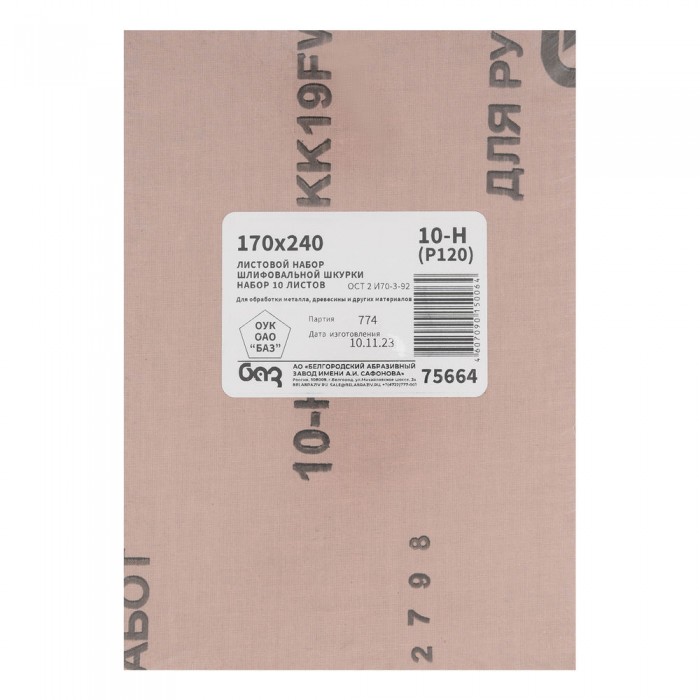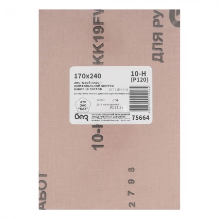 Шлифлист на тканевой основе, зернистость № 10, 240 х 170 мм, 10 шт, водостойкий, "БАЗ" (75664)