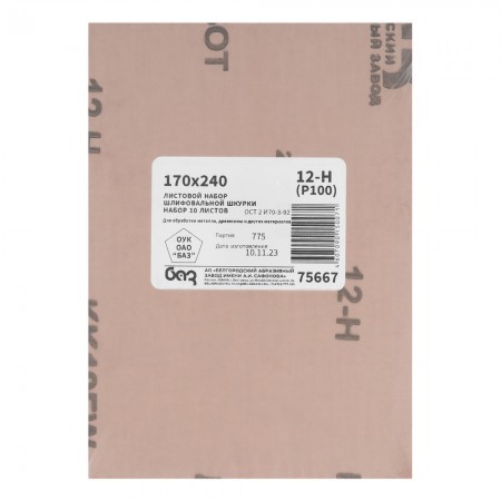 Шлифлист на тканевой основе, зернистость № 12, 240 х 170 мм, 10 шт, водостойкий, "БАЗ" (75667)