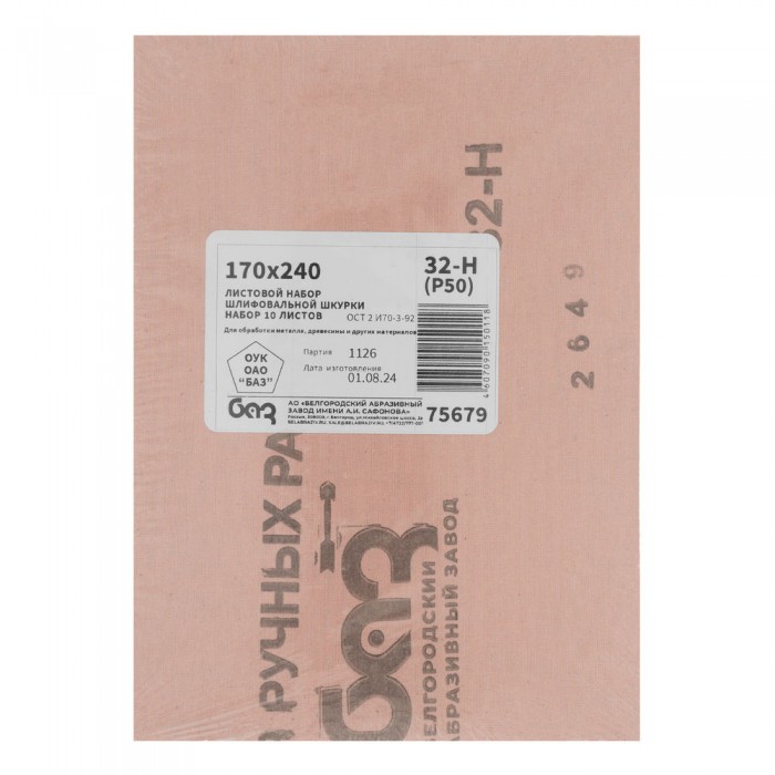 Шлифлист на тканевой основе, зернистость № 32, 240 х 170 мм, 10 шт, водостойкий, "БАЗ" (75679)