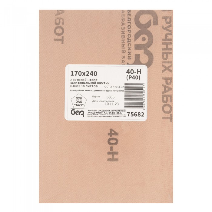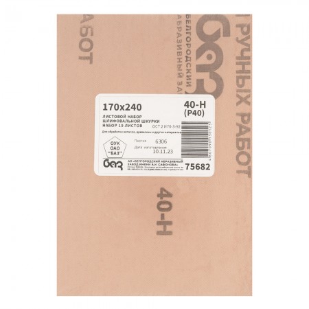 Шлифлист на тканевой основе, зернистость № 40, 240 х 170 мм, 10 шт, водостойкий, "БАЗ" (75682)
