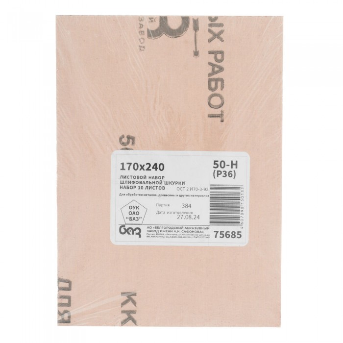 Шлифлист на тканевой основе, зернистость № 50, 240 х 170 мм, 10 шт, водостойкий, "БАЗ" (75685)