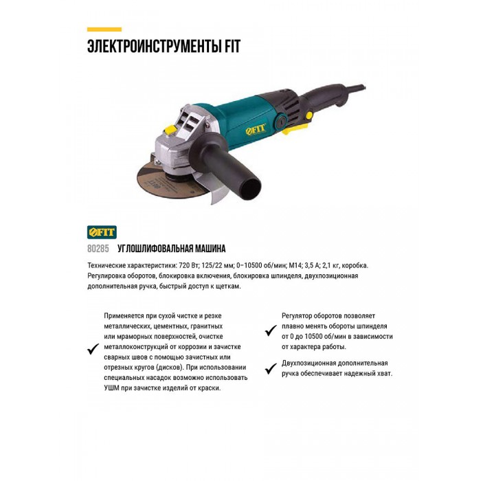 Шлифмашина угловая 720 Вт; 0-10500 об/мин; КлК 125 мм; 2,1 кг; длинная; регулир.оборотов; б/с щеток; кор. (80285)