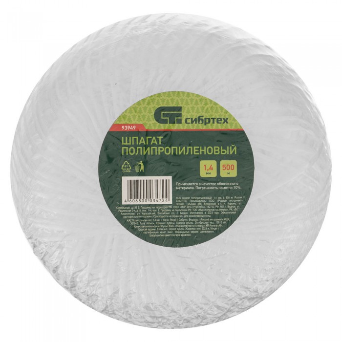 Шпагат полипропиленовый, 1.4 мм, L 500 м, Сибртех (93949)