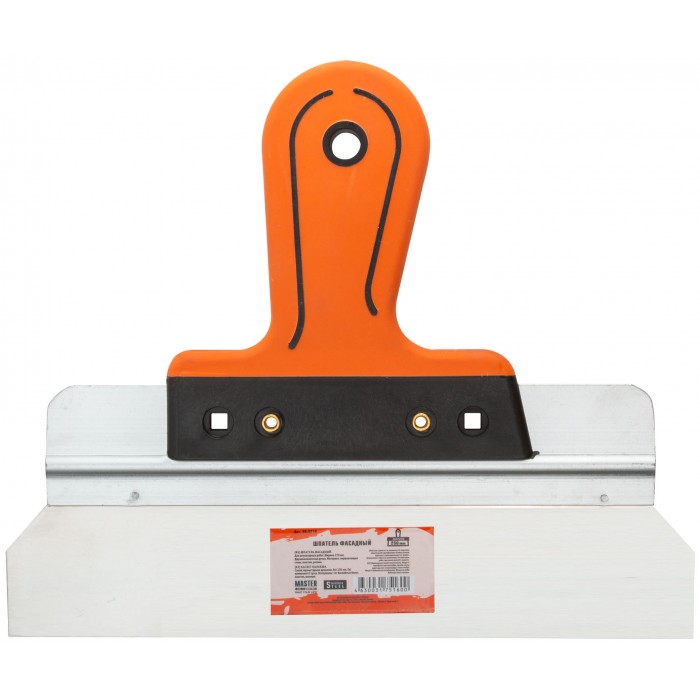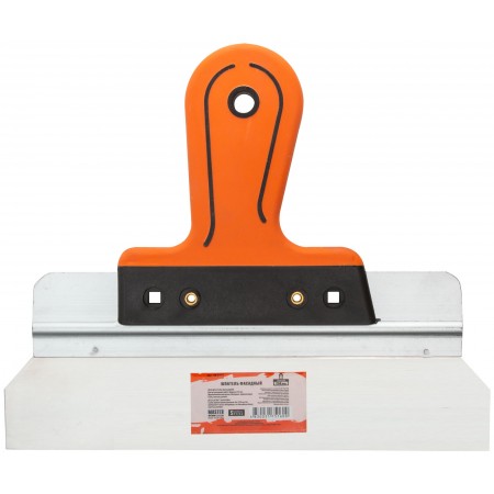 Фасадный шпатель из нержавеющей стали для штукатурных работ. Алюминиевая основа, эргономичная 2-К ручка. Материал: нержавеющая сталь, прорезиненная ручка.