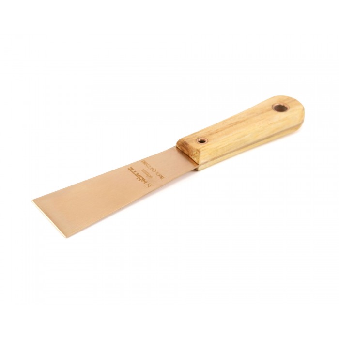 Малярный искробезопасный шпатель с деревянной ручкой HORTZ, предназначен для работы в условиях, где существует риск искрообразования, при контакте с легковоспламеняющимися материалами. Такой шпатель используют, в частности, для нанесения и выравнивания шпатлёвки, а также в отделочных работах для очистки от красок и замазок. Изготавливается в двух вариантах сплавов: алюминиевая бронза и бериллиевая бронза (AL-Cu & Be-Cu). Высокая прочность, высокое качество. Сертифицирован в соответствии со стандартами взрывобезопасности ТР ТС 012/2011.