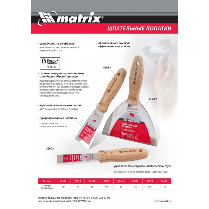 Шпательная лопатка из нержавеющей стали, 50 мм, буковая рукоятка, EFP Matrix (85611)