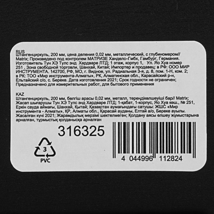 Штангенциркуль, 200 мм, цена деления 0.02 мм, металлический, с глубиномером Matrix (316325)