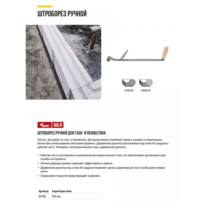 Штроборез ручной для газо- и пенобетона 550 мм, ручка под углом 90 градусов (09788)